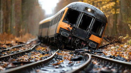 A passenger train has derailed, with its front carriage tilted off the tracks, surrounded by fallen autumn leaves.