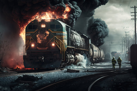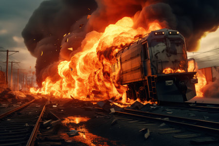 A freight train has caught fire, causing significant damage to the cargo and posing a potential risk to nearby communities due to the potential release of hazardous materials. AI Generative AI