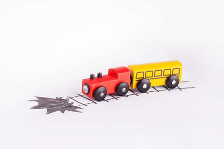 The toy train goes to the damaged railway