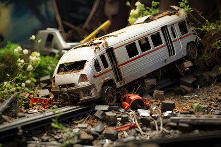 Abandoned railroad tracks with toy cars. Selective focus, Train crashes in car, AI Generated