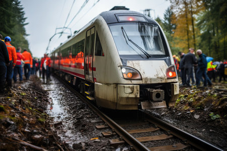 Emergency teams examine a derailed train, assessing damages and collecting evidence following the railway accident.