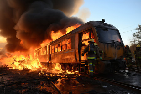 Firefighter in action against the background of a burning train at night, A fireman using water and an extinguisher to fight with fire flames in an accident car on the wayside road, AI Generated