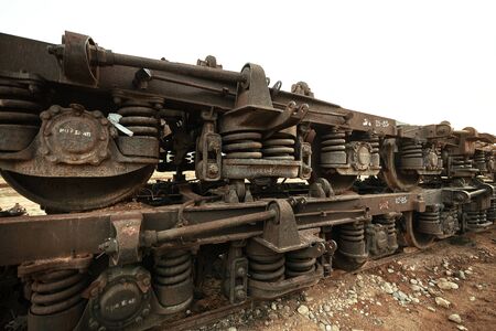Industrial detail of old freight train wheels and rusty railway machinery