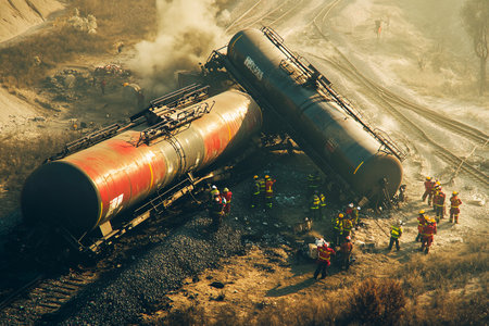 Emergency response teams work diligently at the site of a train derailment, surrounded by smoky debris and overturned tankers. The morning light casts shadows over the chaotic scene.