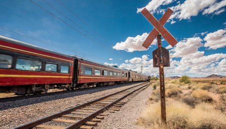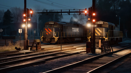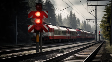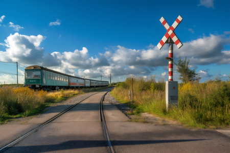 cars stopped at crossing with train approaching in the distance, creating a dramatic scene, created with generative ai