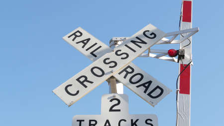 Level crossing warning signal in USA. Crossbuck notice and red traffic light on rail road intersection in California. Railway transportation safety symbol. Caution sign about hazard and train track.