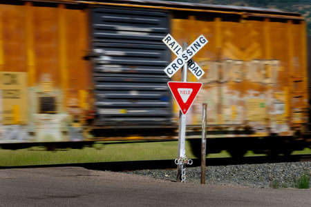 Railroad crossing sign with rail cars and engine blurred speeding by transporting items