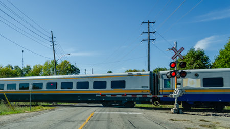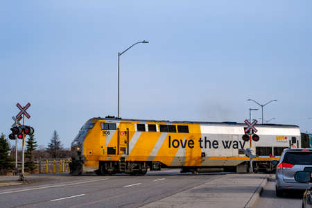 Ottawa, Ontario, Canada - March 25, 2021: A Via Rail train crosses Woodroofe Avenue as it departs Fallowfield Station north of Barrhaven.