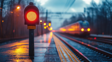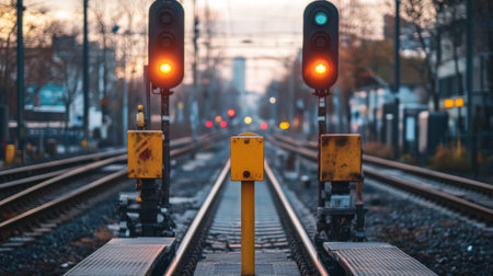 Railway signals shine red at dusk, illuminating the tracks. The urban landscape provides a serene backdrop, showcasing transportation infrastructure and technology.