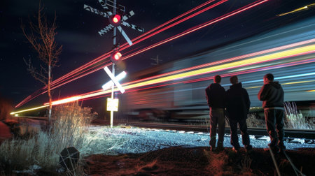 A group of friends leans against a car taking in the sights of a train passing through the railway crossing its lights creating a stunning trail