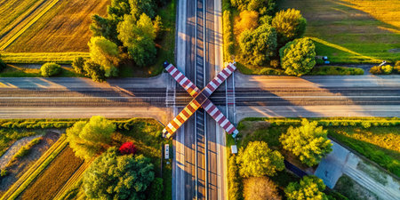 Aerial View of Railroad Crossing Sign, Warning Symbol, Safety, Transportation Infrastructure, Overhead Perspective