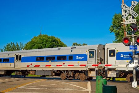 PEEKSKILL, NY - SEPTEMBER 4, 2018: A passenger train on New York’s Metro North Railroad crosses a street on its way into the Peekskill station and then to NYC, an hour south.