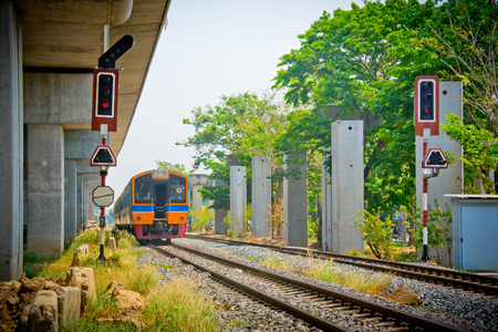 Low angle photo Front of old train led with Diesel Electric locomotives on the tracks of Thailand.
