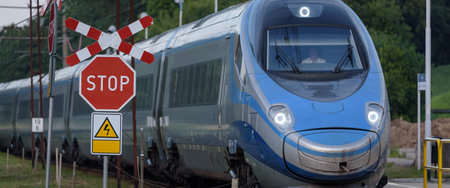 MILOGOSZCZ, WEST POMERANIAN - POLAND - JULY 15, 2023: STOP sign and moving express train at a railroad crossing