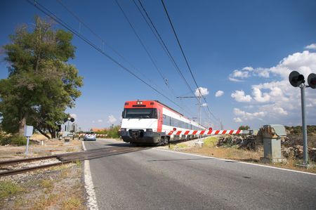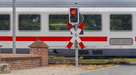 Passenger train cars moving past a level crossing gate on a road in the summer