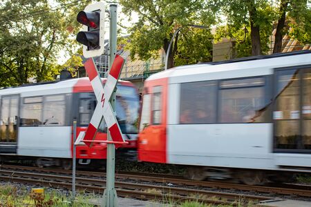 Barriers on a brand new train grade crossing for pedestrians have just closed down on a sunny winter morning, train and cars are rushing past.