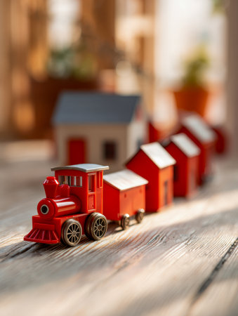 Colorful toy trains in motion on the tracks, miniature locomotives moving gracefully