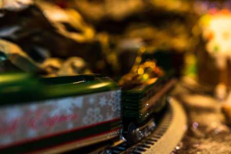Wooden toy train with christmas balls on the background of the Christmas tree