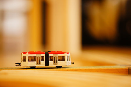 POZNAN, POLAND - Feb 06, 2020: Small Siku brand model toy tram on a wooden surface in soft focus.