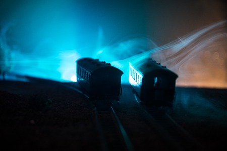 Train moving in fog. Ancient steam locomotive in night. Night train moving on railroad. toned foggy fire background. Horror mystical scene. Selective focus