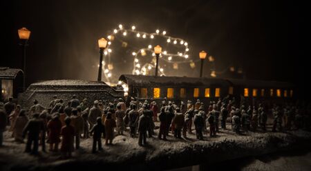 Silhouettes of a crowd standing at old vintage train on foggy background. Selective focus. Creative artwork decoration with toy train