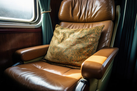 leather armchair in business class compartment of a train, created with generative ai
