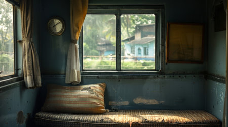 Luxury vintage train interior with tufted seating and plush pillow by large window. Elegant retro travel comfort