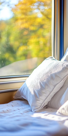 Relaxing Train Journey Through Autumn Landscapes, Cozy Seat with Pillow and Scenic Window Views