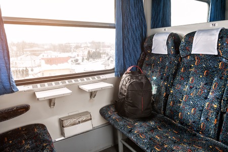 Traveler backpack on an empty train seat. Piercing setting sun rays in the cabin, no people.