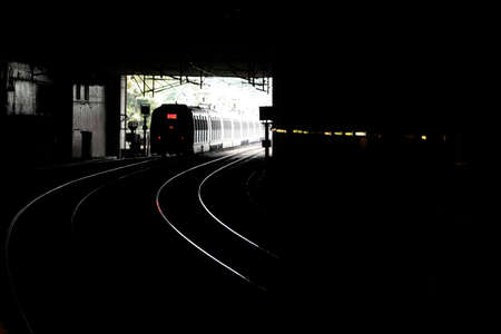 The train and railroad for transportation with sunlight and silhouette, dark tone transport railway