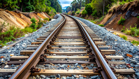Close-up of train tracks, symbolizing journey and exploration. AI generative.