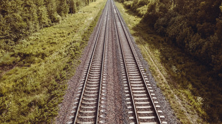 Classic train tracks stretching into the horizon, no people, copy space for text available