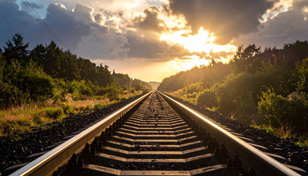 A serene view of railway tracks stretching into the sunset, surrounded by nature. Perfect for themes of travel, solitude, and exploration in tranquil landscapes.