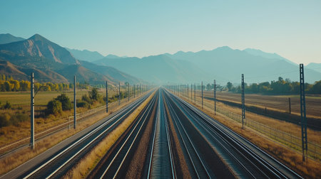 Majestic view of railway tracks stretching into the distance, framed by mountains and open fields under a clear blue sky, offering a sense of tranquility and adventure.