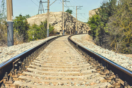 Railway tracks in the countryside. Perspective view of the railway.