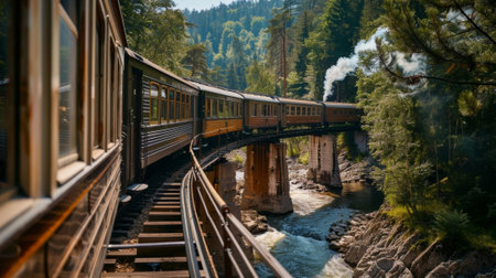 Crossing a towering bridge over a rushing river a historic steam train making its way through a scenic landscape