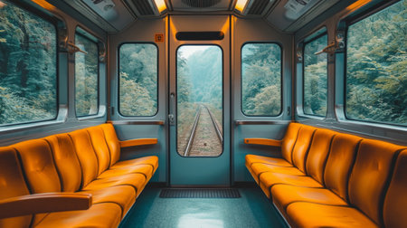 A sleek train interior showcases empty seats arranged in rows illuminated by warm lighting. The ambiance is calm hinting at a peaceful journey ahead. The design emphasizes comfort and modernity.