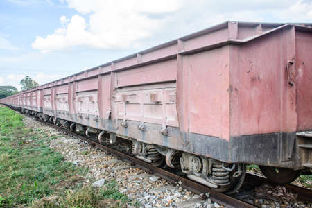 The red carriages of the railway train ride on the rails. Transportation of goods by trains