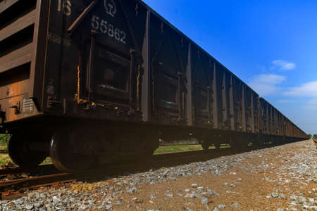 Close up Steel railroad fasteners.Iron nuts fastened to railway tracks.Rusty old iron freight train In the train station, Thai train stops at the station.soft focus.