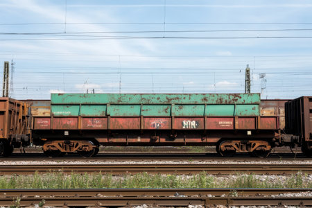 A weathered freight train car with a green and brown cargo container rests on the tracks in an industrial area. The car displays signs of rust and wear reflecting years of service