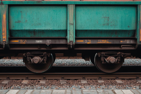This close up reveals the wheels and side of a turquoise freight train car displaying its weathered texture and utilitarian design. The car rests on metal tracks surrounded by gravel suggesting the operational hub of a railway network