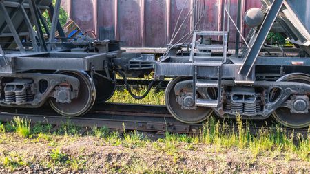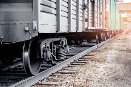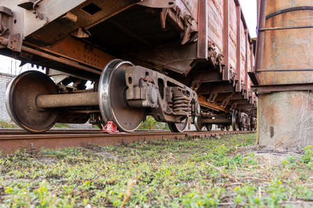 Old rusty rolling stock, freight cars on tracks. Train wheels close up. Concept, freight.