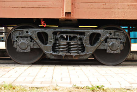 Steel wheels of a freight car running on rails, visible semi-elliptical springs.