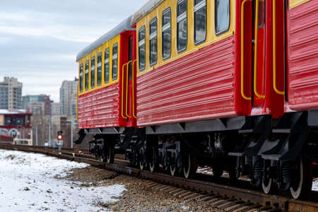 passenger train cars on a narrow gauge railway against the background of the city