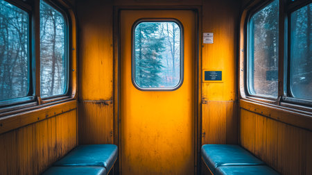Inside a vintage train compartment a bright yellow door stands out amidst the wooden surroundings. Blue benches line the walls creating a nostalgic atmosphere in a tranquil setting.