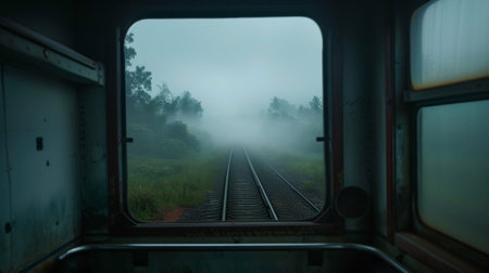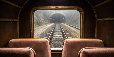 A railway view from inside a train shows empty seats and tracks leading into a dark tunnel. The atmosphere is moody, hinting at an adventurous journey ahead.