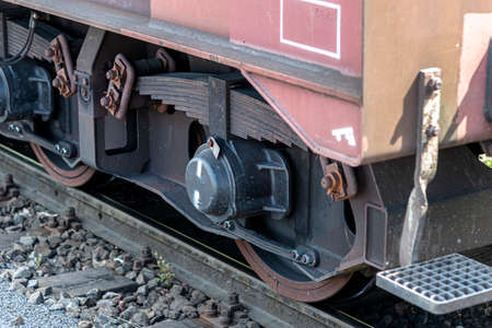 Close up of wheels of an axle of a red railroad railway wagon on rails