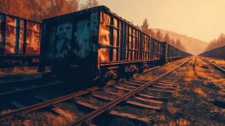 unclaimed rusty freight wagons derailed or on abandoned branches. wartime, crisis, misfortune, disaster. environment and insurance concept.Generative AI