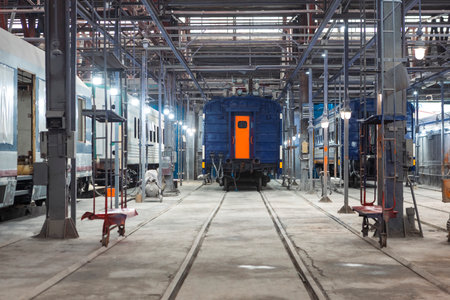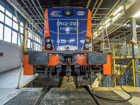 Warsaw, Poland - October 20, 2017: Train inside depot. Area for maintenance, repair and service of passenger trains and wagons