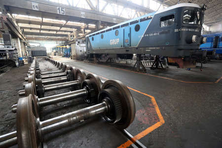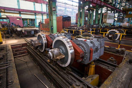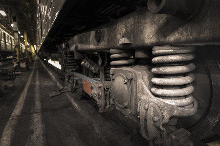 The old diesel train inside of mechanical workshop during maintenance and improvement wheels with suspension system, perspective side view